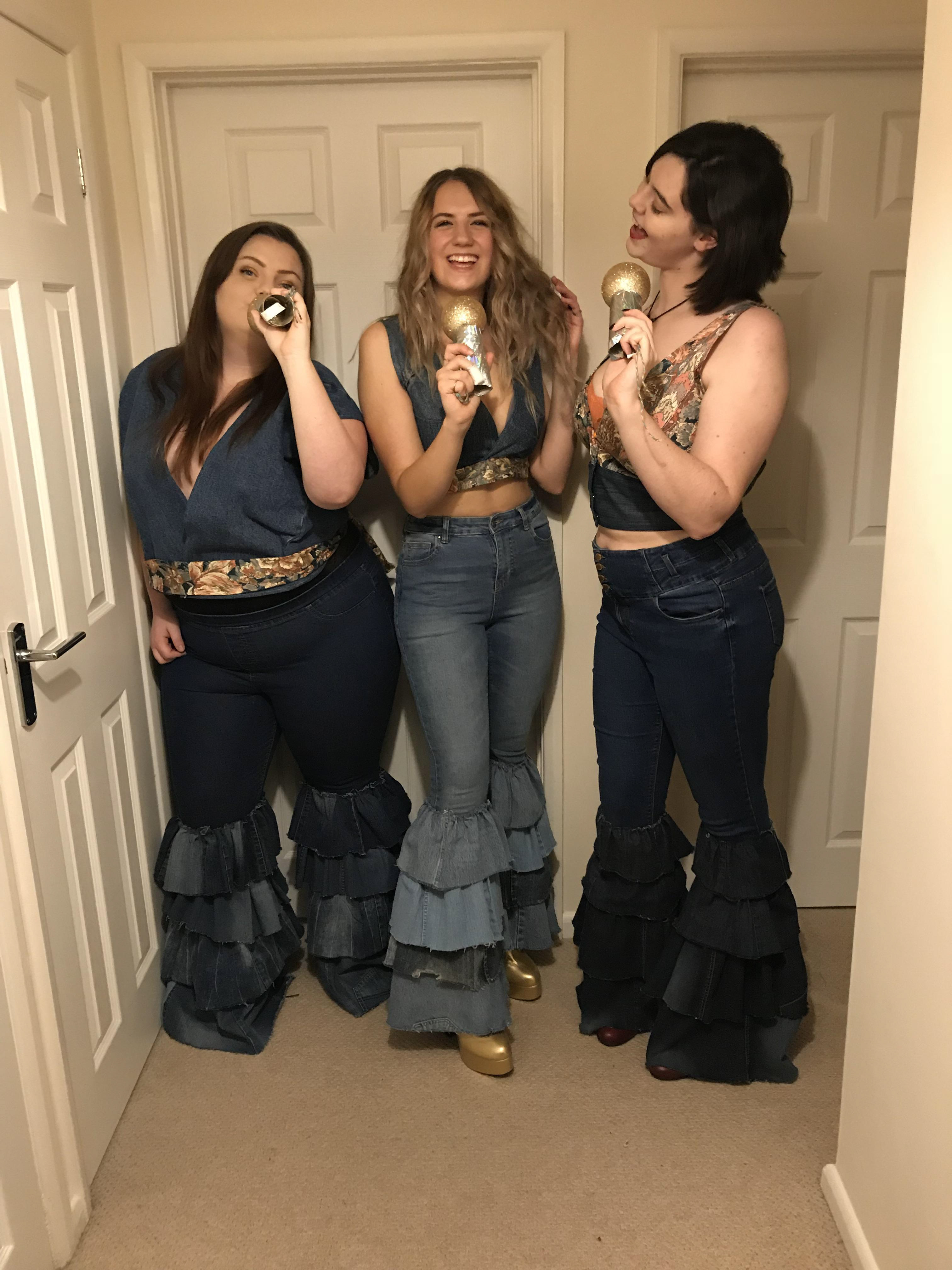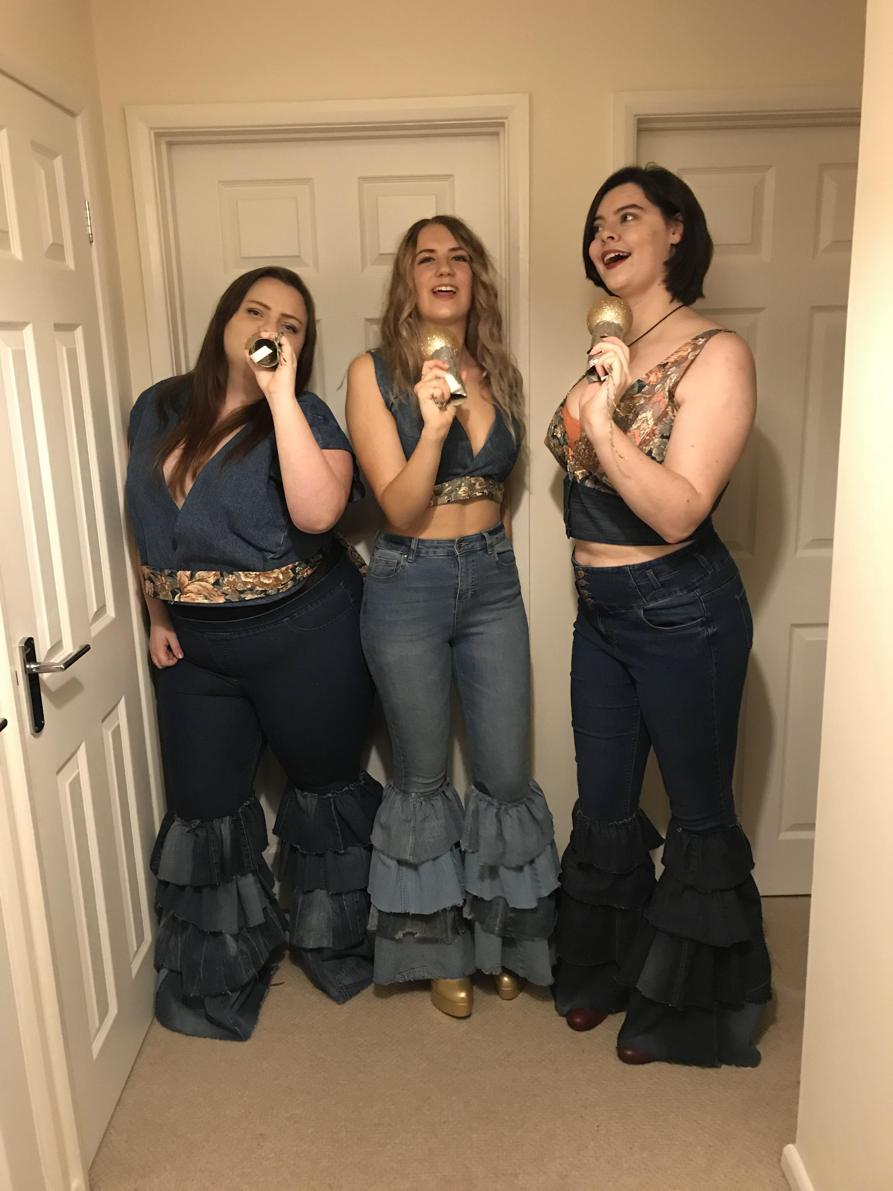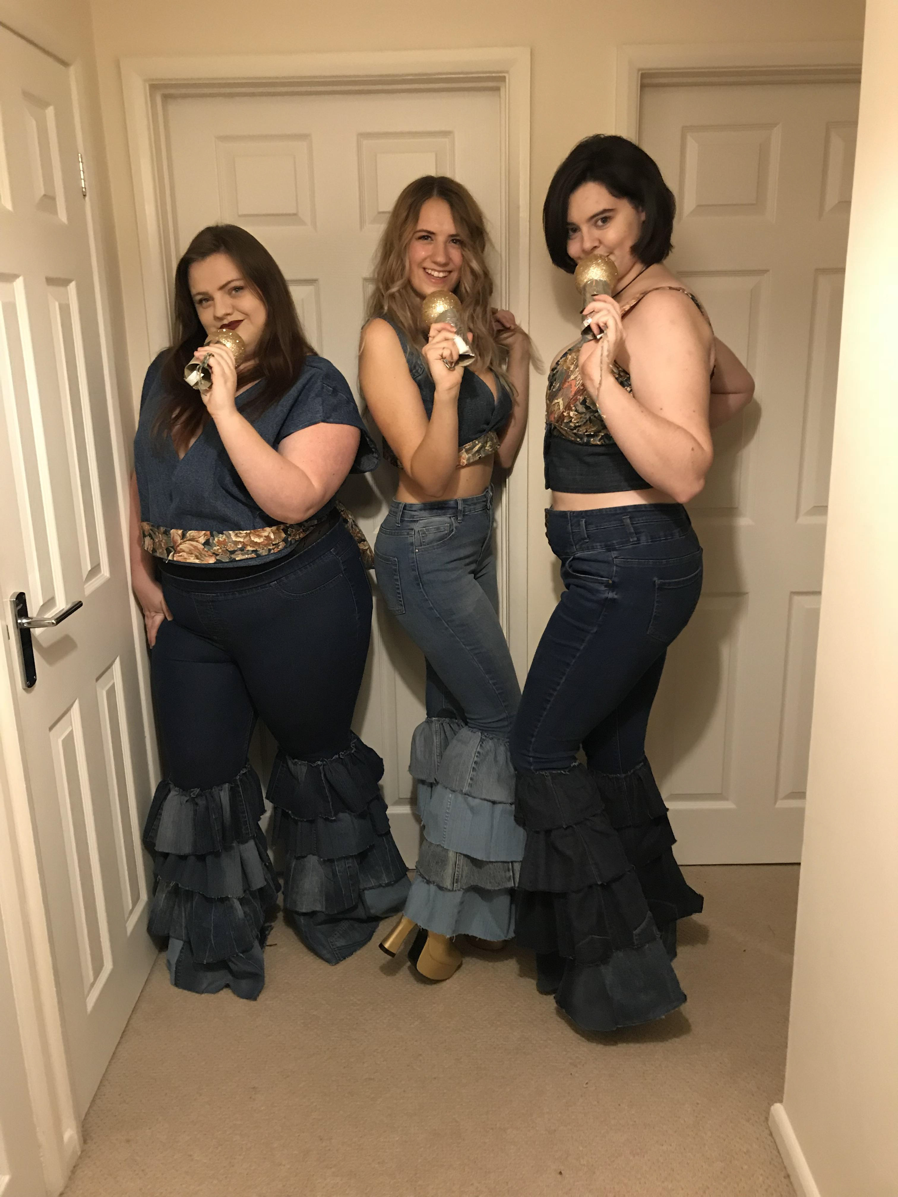 Donna and the Dynamos costumes inspired by the film "Mamma Mia! Here we go again!" Entirely made from old clothes and scraps of fabric. Jeans were made from many pairs of old jeans, all from charity shops or from around our homes. Denim jacket was made from a single pair of jeans cleverly pattern cut Tops were made from some very 70s fabric I found laying around !